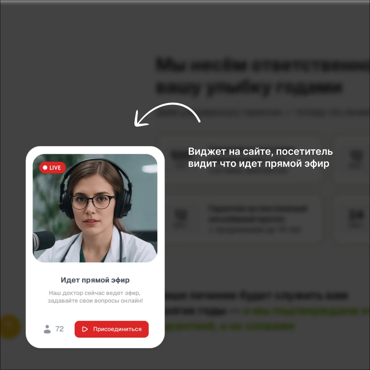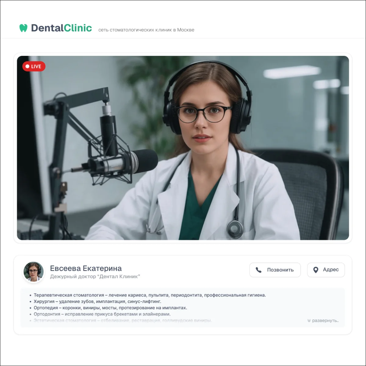 Инструмент для роста конверсии сайта до 40–60%. На странице появляется «лицо» компании — живой представитель или ИИ-аватар, с которым клиент говорит в реальном времени, а не ждёт ответа на заявку. Решение для B2B и сетей филиалов: рекламный бюджет работает эффективнее. По сути клиент общается с вашей базой знаний, которую мы соберём под ключ.