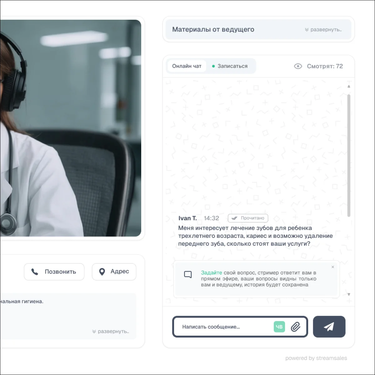 В эфире работает либо оператор, либо ИИ-аватар — отвечает по регламенту и сценариям компании.